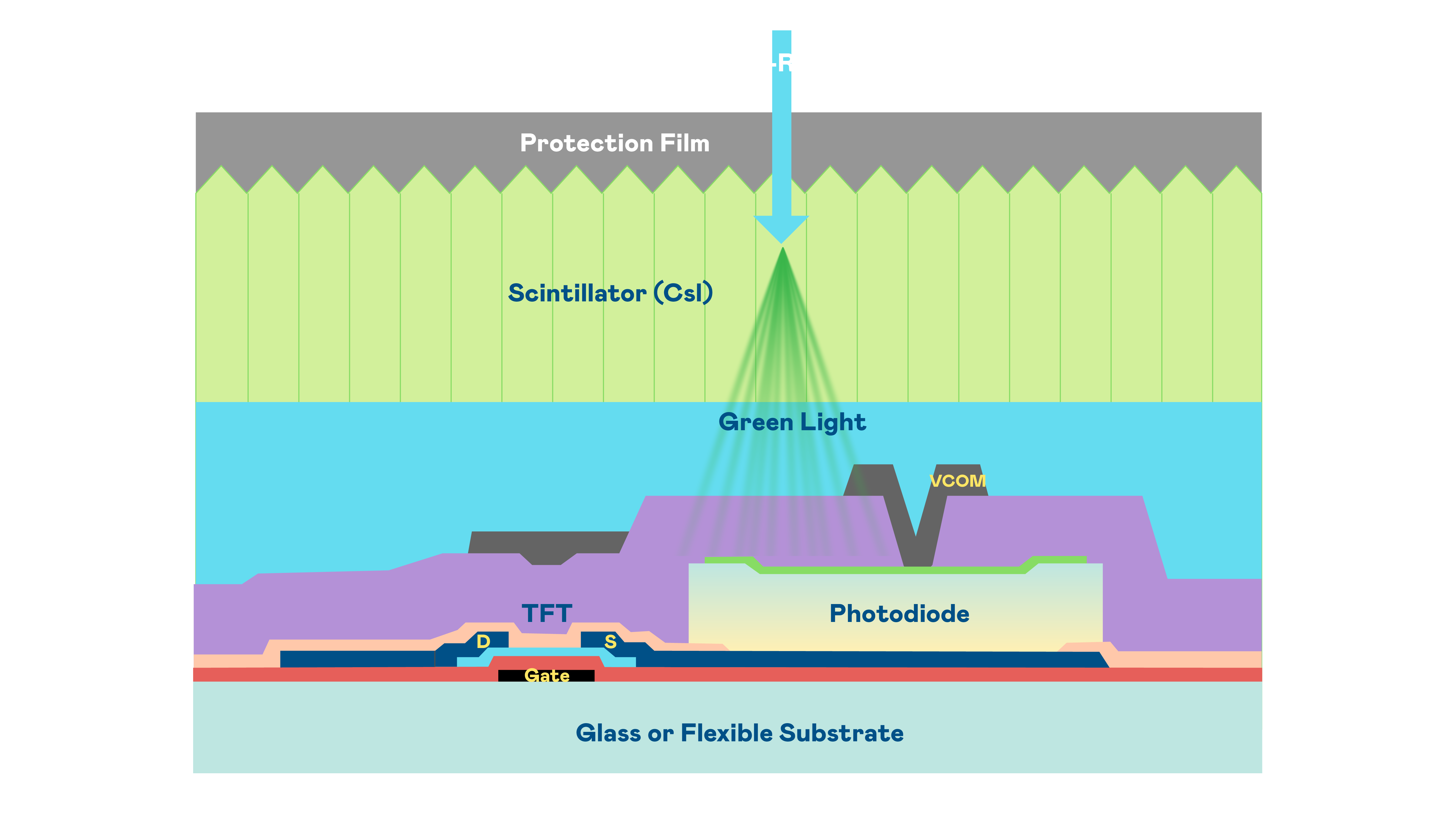 环球360的X光影像感测阵列使用薄膜电晶体 (TFT) 作为每个像素的读取开关,搭配光电二极体(Photodiode)的光电转换元件,用以感测X光影像讯号。